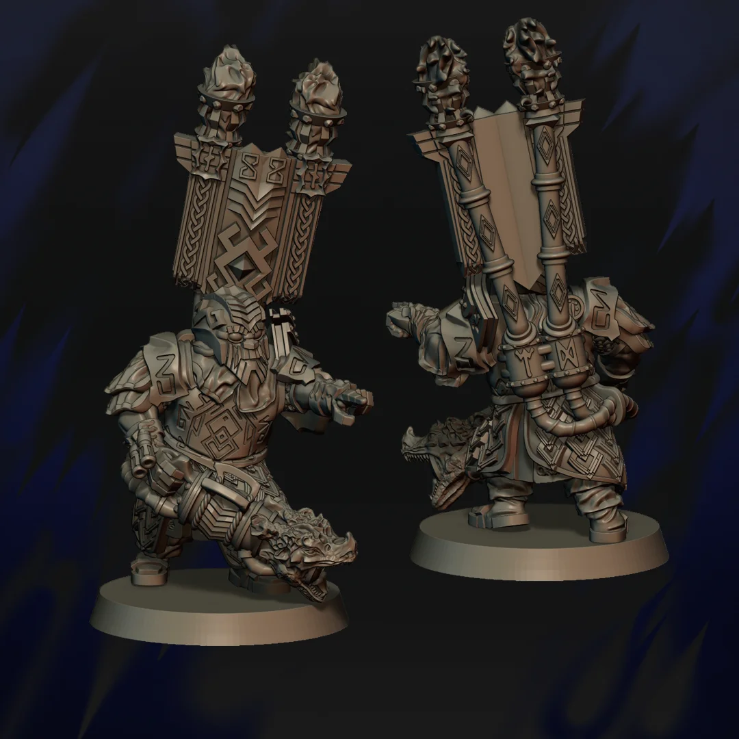 Grupo de mando de Guardianes de la Forja con campeón, músico y estandarte.